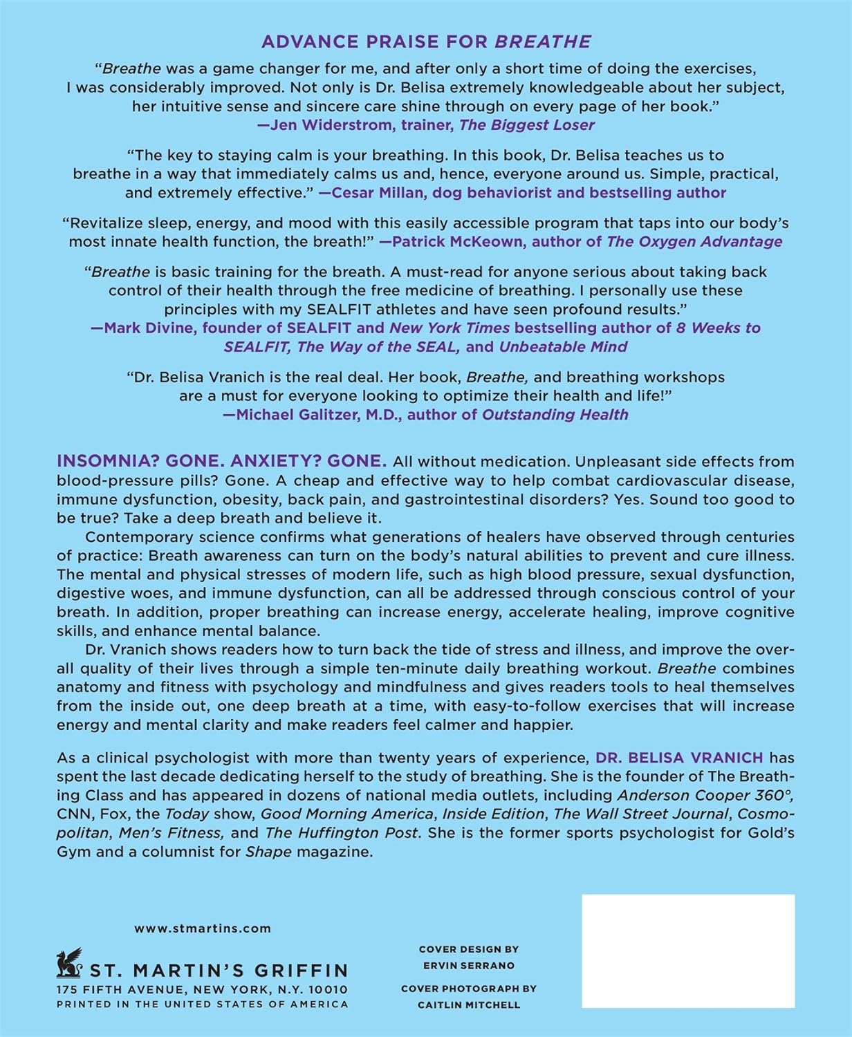 Yet most of us stopped breathing in the anatomically “right” way, the way to take advantage of these benefits, when we were four or five years old. We now mostly breathe in a way that is anatomically incongruous and makes for more illness. Dr. Vranich shows readers how to turn back the tide of stress and illness, and improve the overall quality of their life through a daily breathing workout. In a fascinating, straightforward, jargon-free exploration of how our bodies were meant to breathe, Dr. Belisa Vranich delves into the ins and outs of proper breathing. By combining both anatomy and fitness with psychology and mindfulness, Dr. Vranich gives readers a way of solving health problems at the crux and healing themselves from the inside out. BREATHE is an easy-to-follow guide to breathing exercises that will increase energy, help lose weight, and make readers feel calmer and happier.