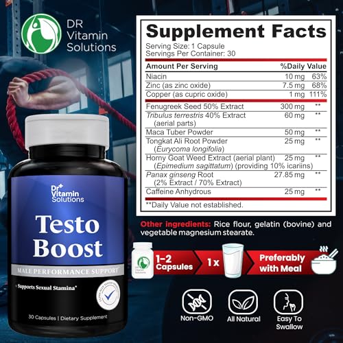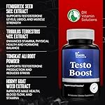 Powerful Blend for Male Health: Dr. Vitamin’s Testo Boost testosterone supplement for men combines Fenugreek, Tribulus, Tongkat Ali, Horny Goat Weed, Maca, and Panax Ginseng to support testosterone levels, energy enhancement, and stamina for improved performance.