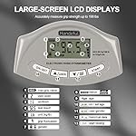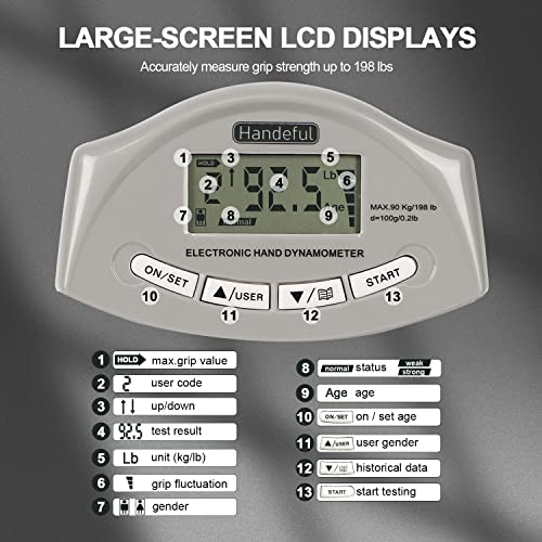 [LCD Display] – Large LCD screen shows all measurements clearly on the same screen. Displayed measurements include user code, age, gender, grip value in pound or kg, and grip status. A maximum grip value display and weak, normal or strong power levels can be saved and easily recalled for comparison.