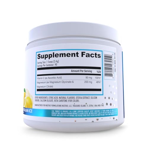 Supplement Facts: Each bottle now contains 90 servings of scoop-able, Lemon Italian Ice flavored powder. It is gluten* and dairy-free** and non-GMO**. Active ingredients include 90mg of Vitamin C and 200mg of Magnesium (as Bisglycinate Chelate, Magnesium Citrate).