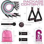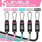Adjustable Resistance Bands Set: 5 resistance levels, Pink 10 lbs, Medium pink 20 lbs, Blue 30 lbs, Grey 40 lbs, Black 50 lbs. Stackable exercise bands, both in 51″, maximum resistance is 150 lbs