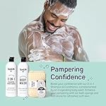 INVIGORATE AND HYDRATE: Our pH-balanced Invigorating 2-in-1 Shampoo and Conditioner, infused with menthol and tea tree oil for cleansing, fortifying, and promoting scalp health, banishes dryness and dandruff. Complement this with our Soothing Post-Shave Lotion, your rescue from post-shave discomfort, for deep hydration, a soothing sensation.
